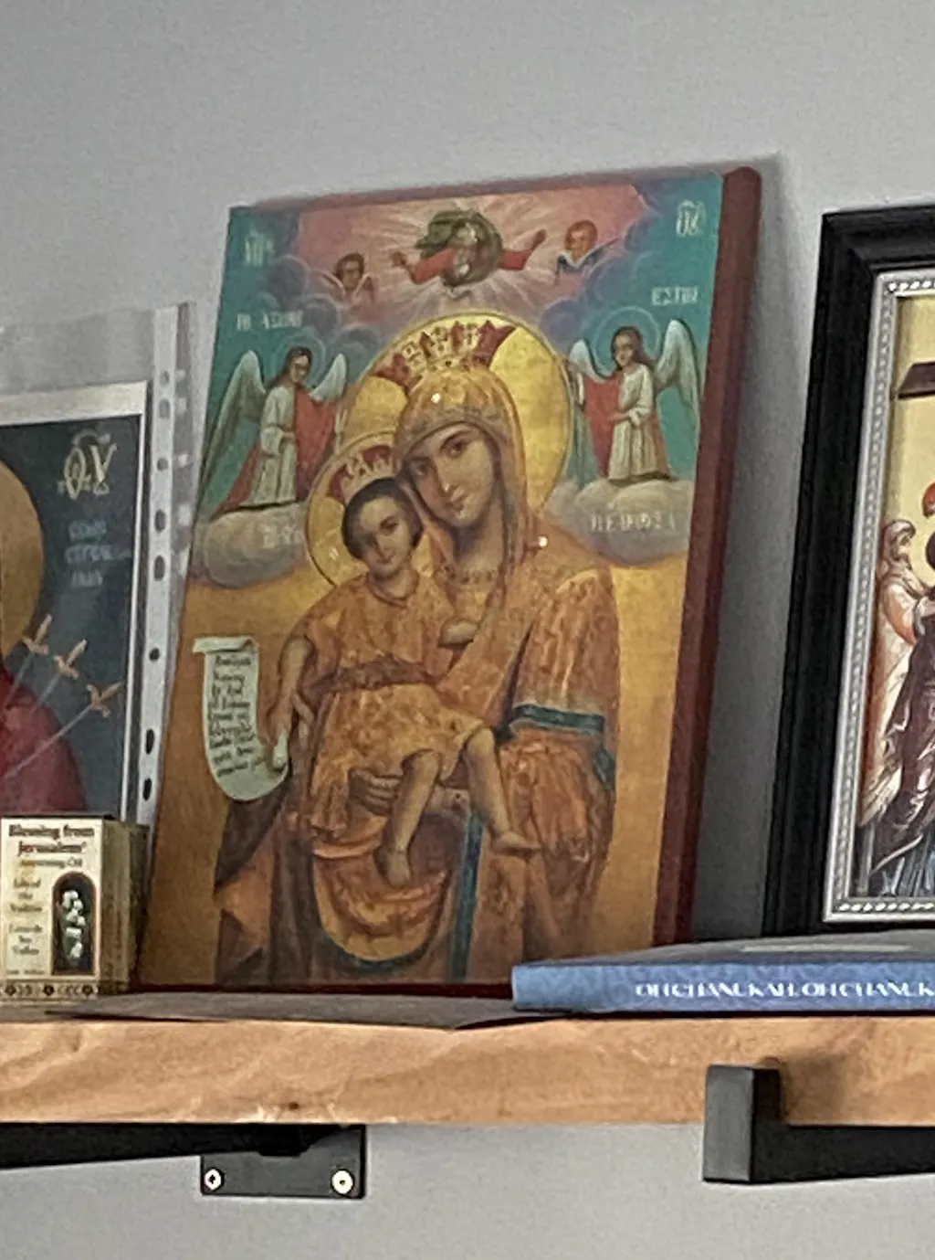 Mother of God, Axion Estin It is Truly Meet, high quality Byzantine icon print from Greece, mounted and laminated on a rectangular straight-edge HDF plaque, with a keyhole in the back for wall hanging. The sides and the back of the icon are painted Byzantine red.
