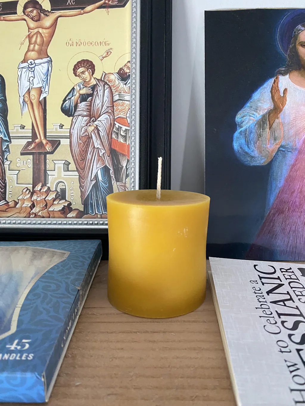 100% pure beeswax candles hand dipped at the monastery using local pure beeswax. Our candles are pure beeswax with no additives, the wicks are made with 100% cotton. The pillar measures 3", 4" or 5" in height and 3" in diameter.