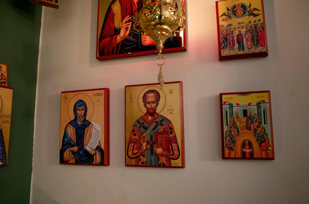 Wood trim is painted Byzantine red. On the gold gilded background icons, a resistant epoxy varnish with a beautiful crystal finish is applied and you have the choice of the language for the writing on the icon.